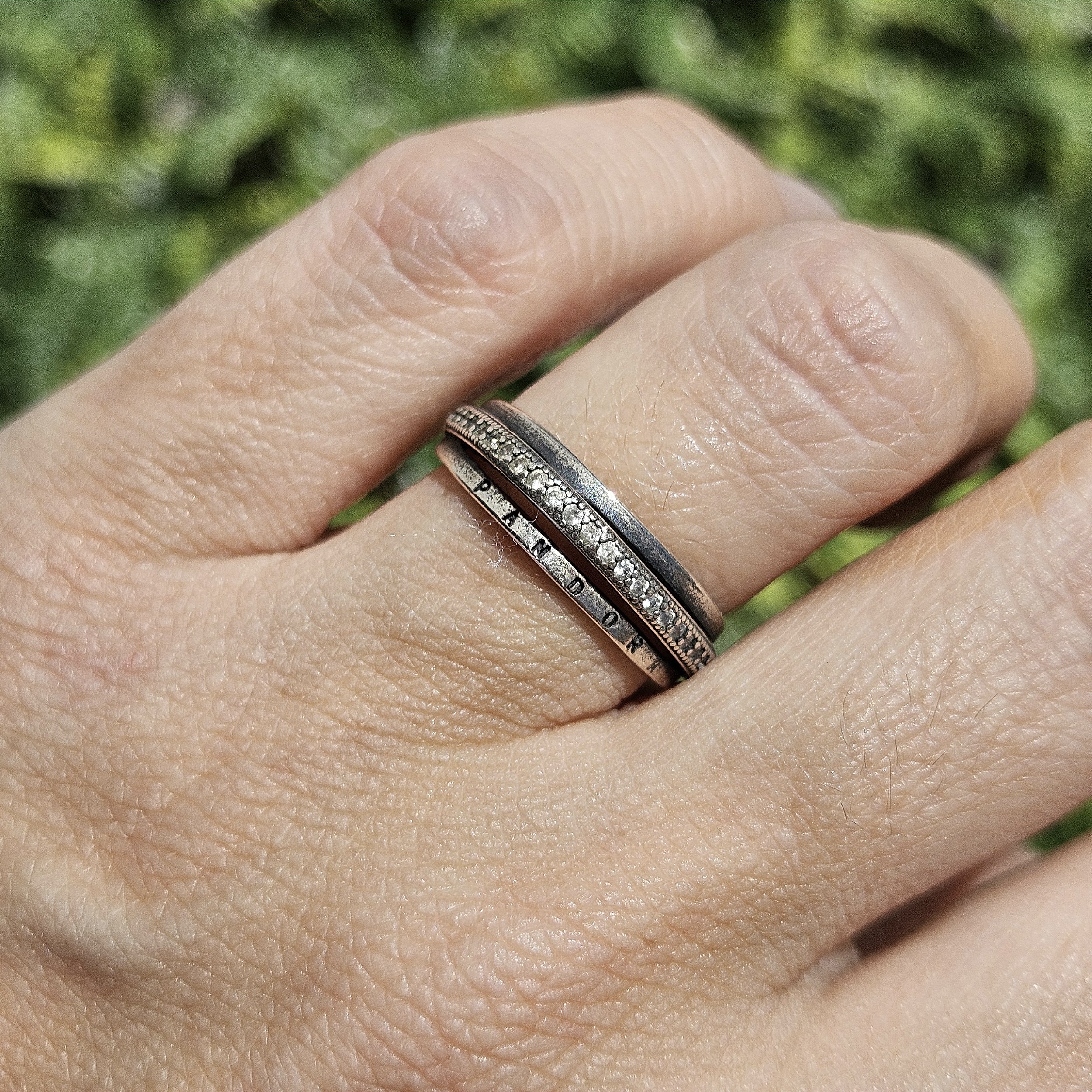 Anel de prata 3 fios, um fio escrito Pandora, do meio cravejado e outro liso
