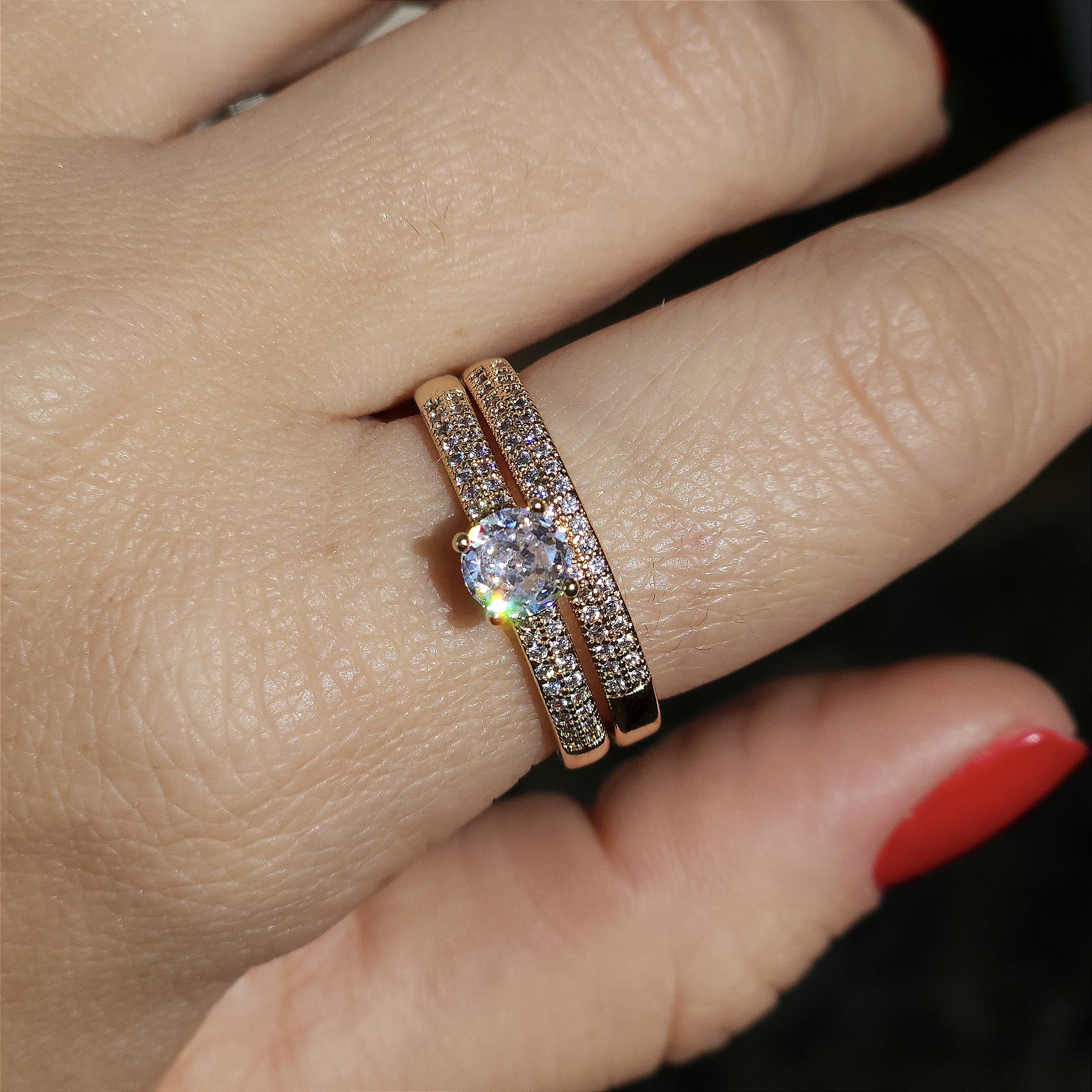 ANEL DOURADO DUPLO APARADOR E SOLITARIO COM MEIA ALIANÇA CRAVEJADA