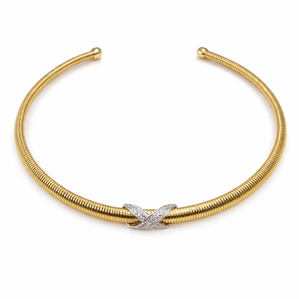 ARO DOURADO ESPIRAL COM PINGETE DE X TODO CRAVEJADO EM RODIO BRANCO