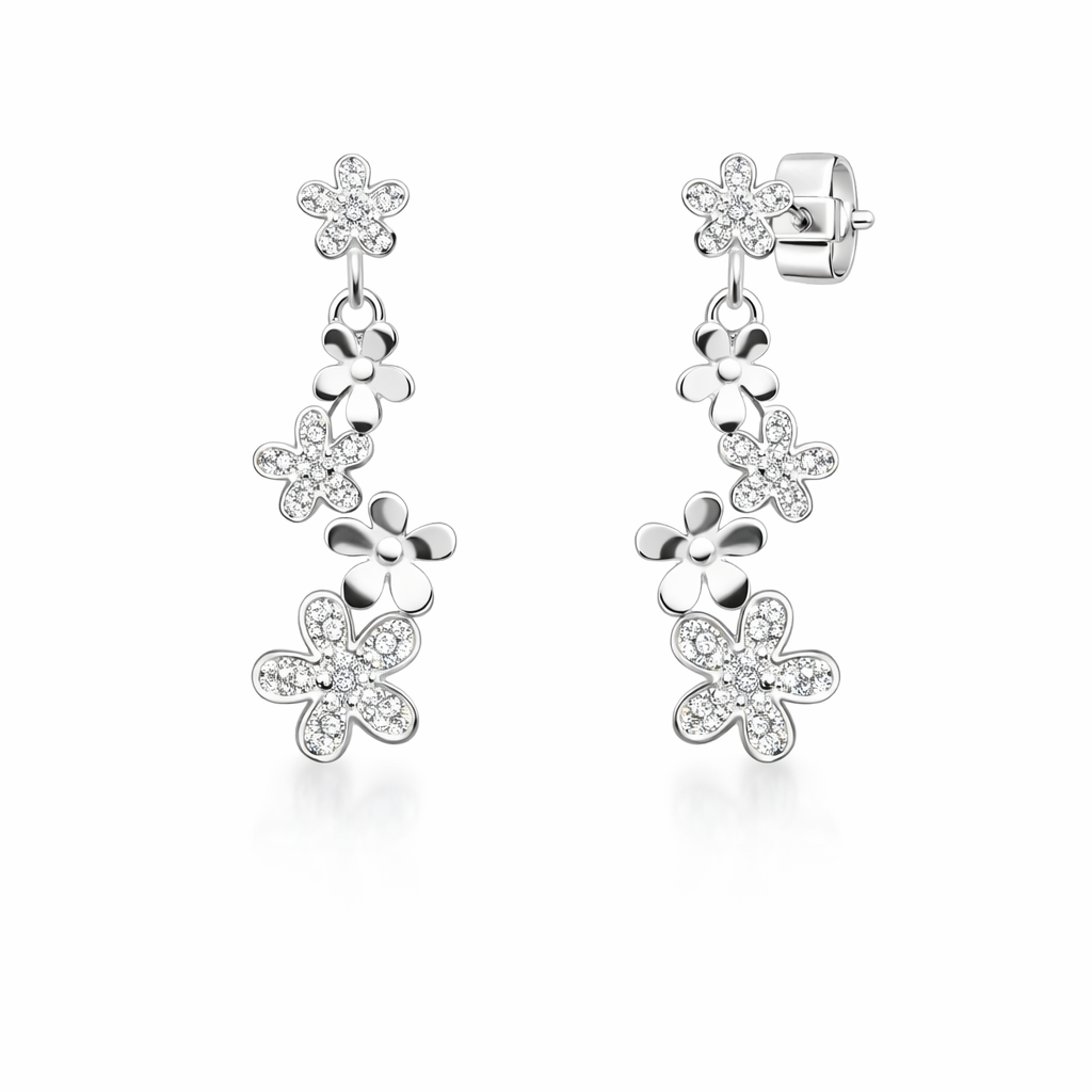 BRINCO DE PRATA MODELO FLORES PENDURADAS - LISAS E COM ZIRCÔNIAS BRANCAS