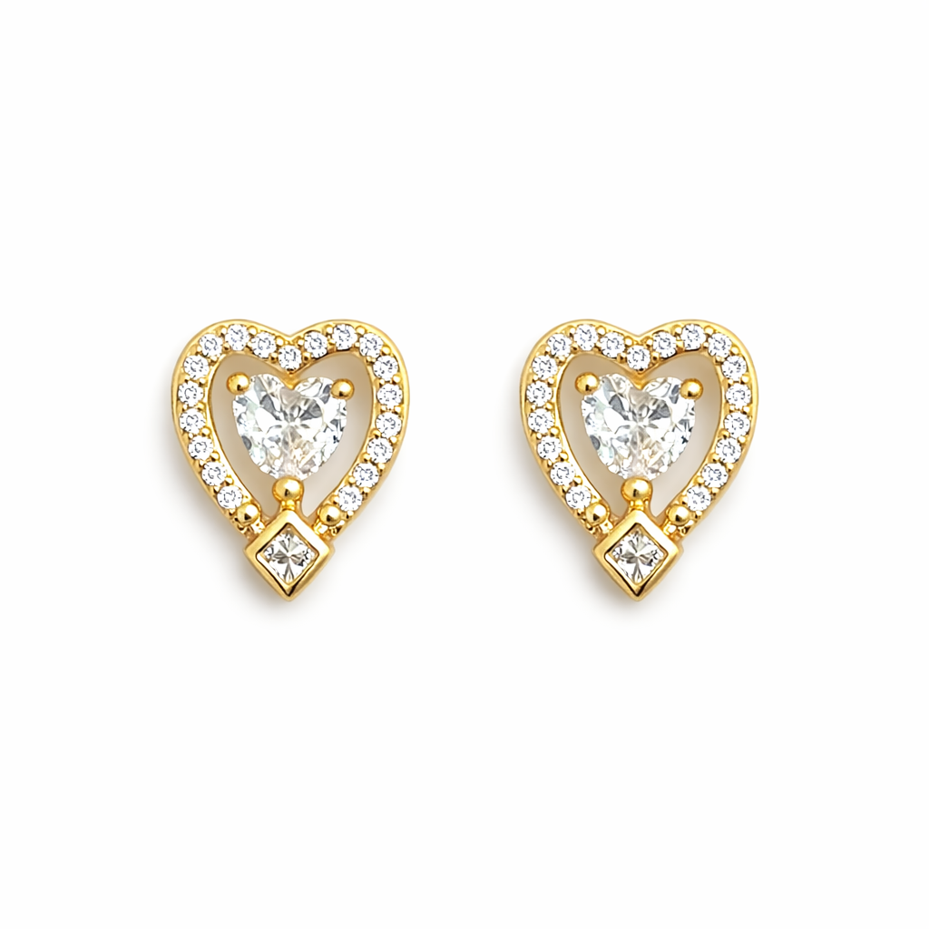BRINCO DOURADO COM PEDRA PONTO DE LUZ FORMATO DE CORAÇÃO E CRAVEJADO AO REDOR