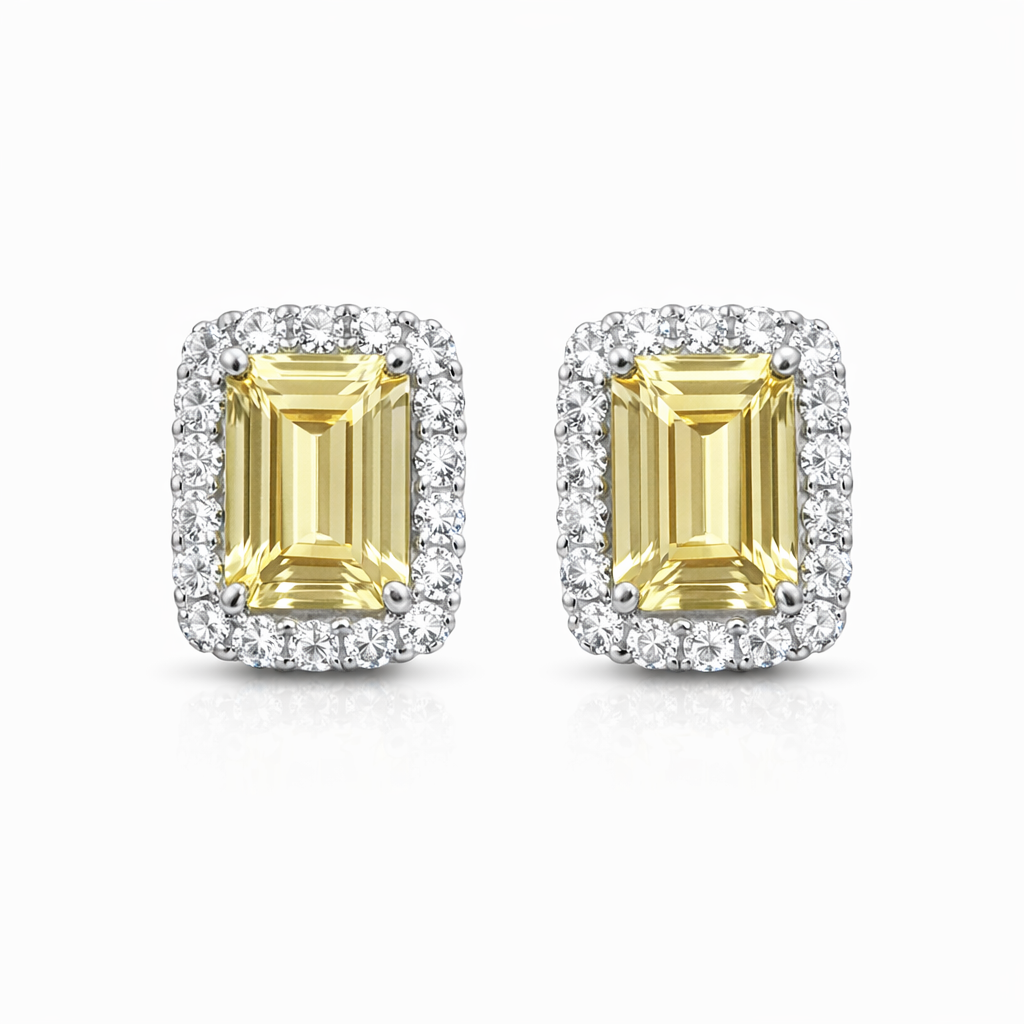 BRINCO EM RODIO BRANCO COM PEDRA RETANGULAR AMARELO CRAVEJADO AO REDOR