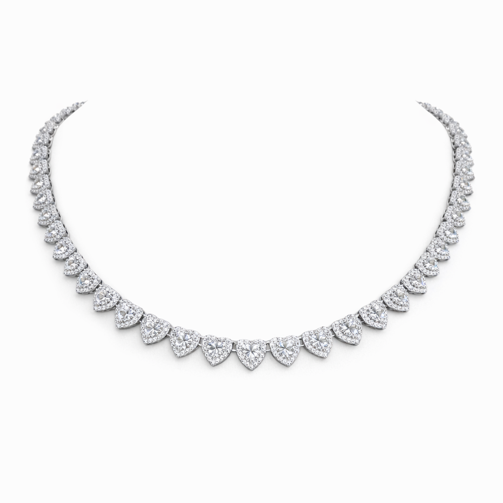 CHOCKER DE RÓDIO BRANCO MODELO RIVIERA COM ZIRCÔNIAS EM FORMATO DE CORAÇÃO TODO CRAVEJADO AO REDOR 40CM