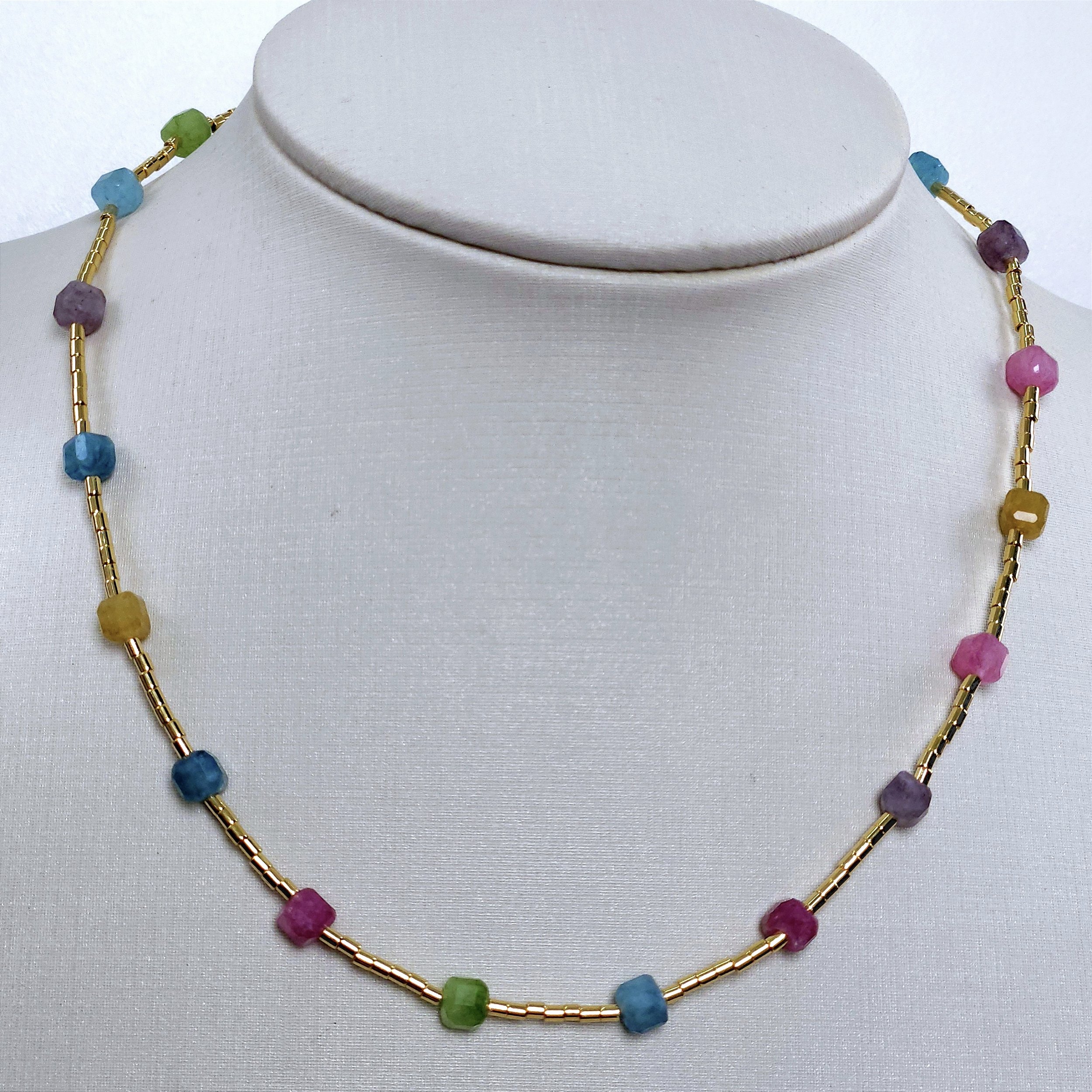CHOCKER DOURADA CANUDINHO INTERCALANDO BOLINAS DE PEDRAS NATURAIS COLORIDAS