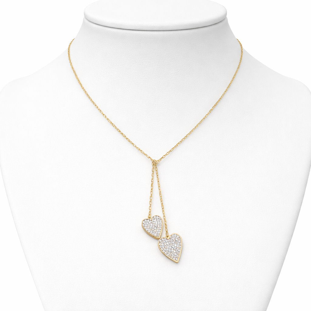 CHOCKER DOURADA COM 2 PINGENTES PENDURADOS DE CORAÇÃO TODO CRAVEJADO 40CM