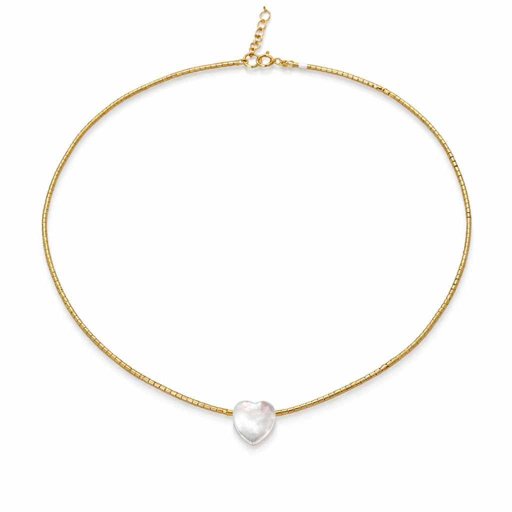 CHOCKER DOURADA ELOS TIPO CANUDINHO COM PINGENTE DE CORAÇÃO EM MADREPÉROLA