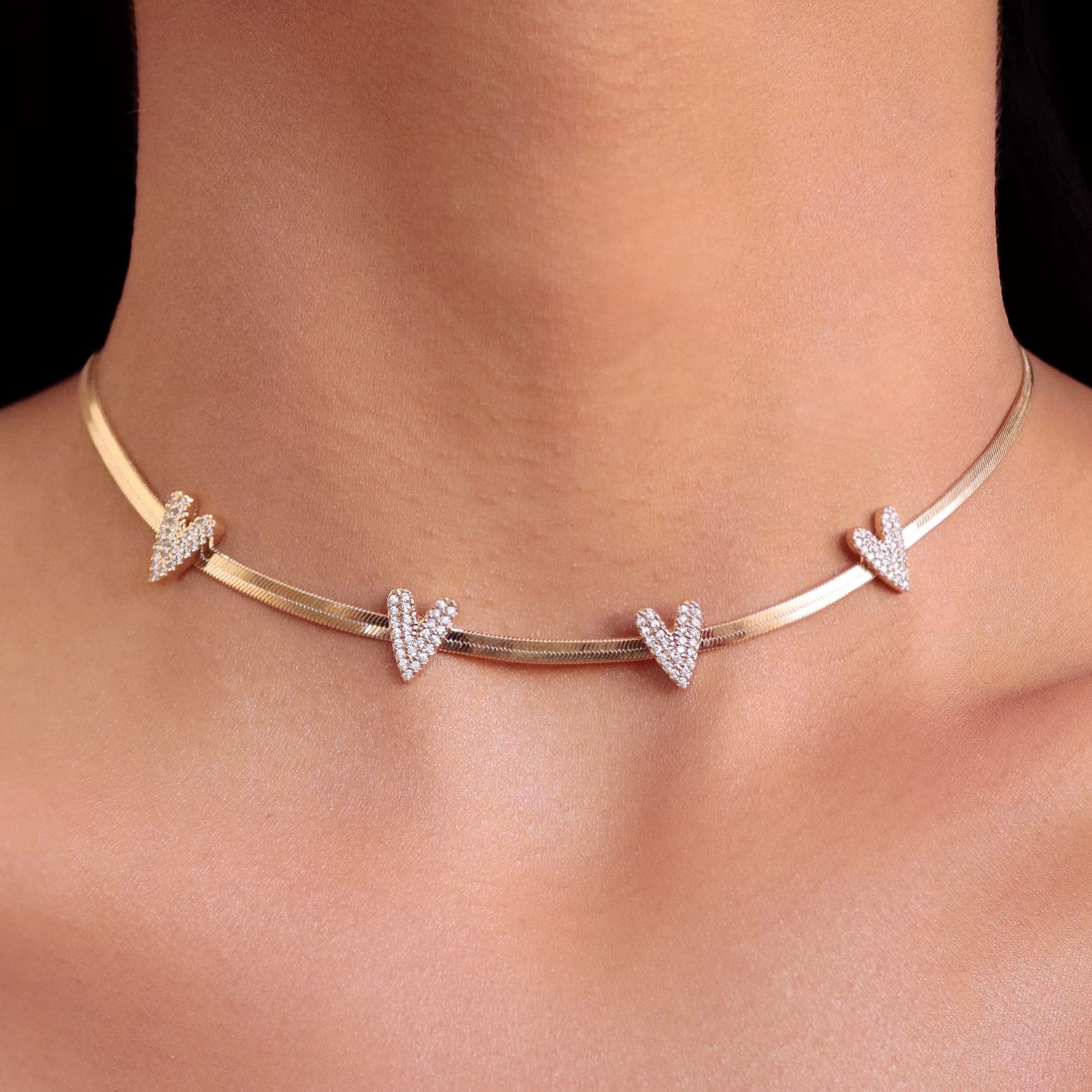 CHOCKER DOURADA FITA COM QUATRO CORAÇÕES CRAVEJADOS - 30CM + EXTENSOR