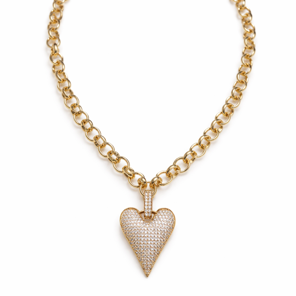COLAR DOURADO COM ELO PORTUGUES E PINGENTE DE CORAÇÃO TODO CRAVEJADO GRANDE