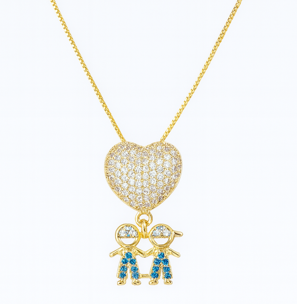 COLAR DOURADO COM PINGENTE DE CORAÇÃO E 2 MENINOS TODOS CRAVEJADOS 45CM