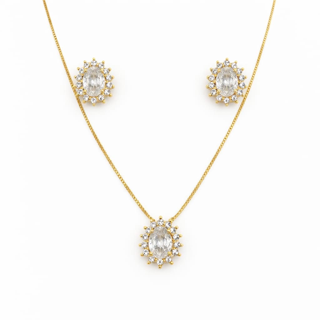 CONJUNTO DOURADO BRINCO E COLAR COM CRISTAL OVAL E ZIRCÔNIAS AO REDOR