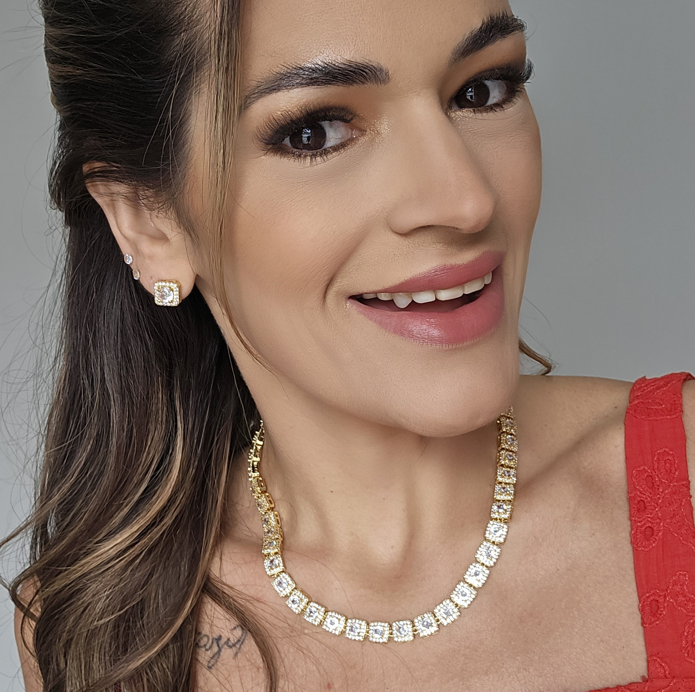 CONJUNTO DOURADO COLAR E BRINCO PONTO DE LUZ QUADRADO COM PEDRAS DE ZIRCÔNIAS AO REDOR - TIPO RIVIERA