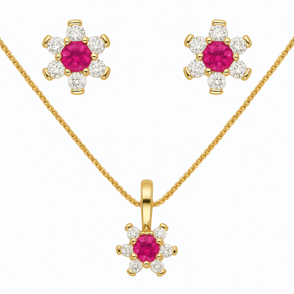 CONJUNTO DOURADO COM PINGENTE E BRINCOS DE FLOR ROSA