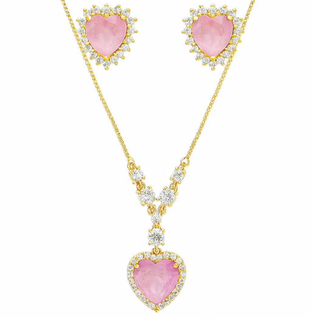 CONJUNTO DOURADO CORAÇÃO ROSA CLARO COM PEDRAS DE ZIRCÔNIAS BRANCAS