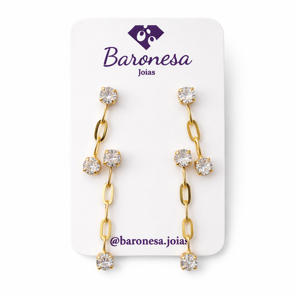DUPLA DE BRINCOS DOURADOS PONTO DE LUZ COM CORRENTINHA PENDURADA E PONTO DE LUZ NA PONTA DO MAIOR PARA O MENOR