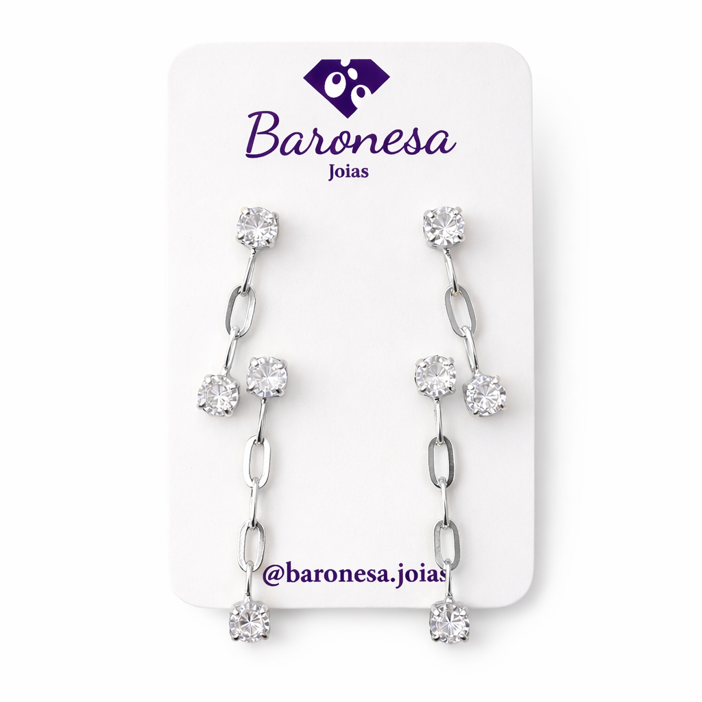 DUPLA DE BRINCOS EM RÓDIO BRANCO PONTO DE LUZ COM CORRENTINHA PENDURADA E PONTO DE LUZ NA PONTA DO MAIOR PARA O MENOR