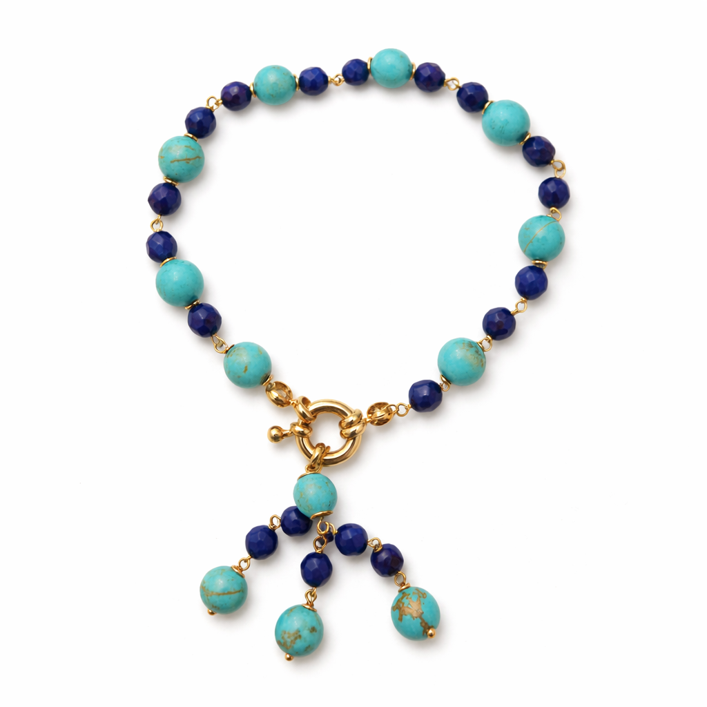PULSEIRA DOURADA DE BOLINHAS VERDE E AZUL COM FECHO BOIA