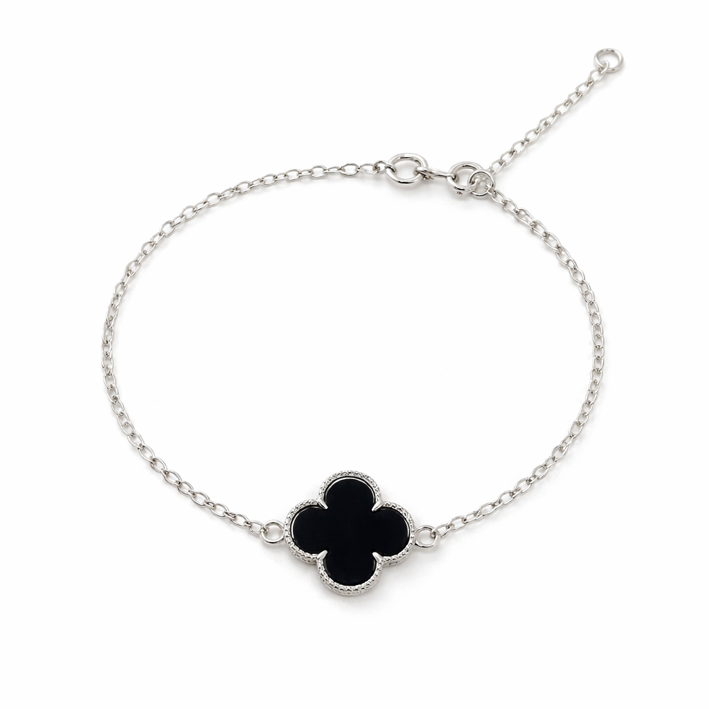 PULSEIRA DE PRATA COM 1 TREVOS DE 4 FOLHAS PEDRA NEGRA GRANDE