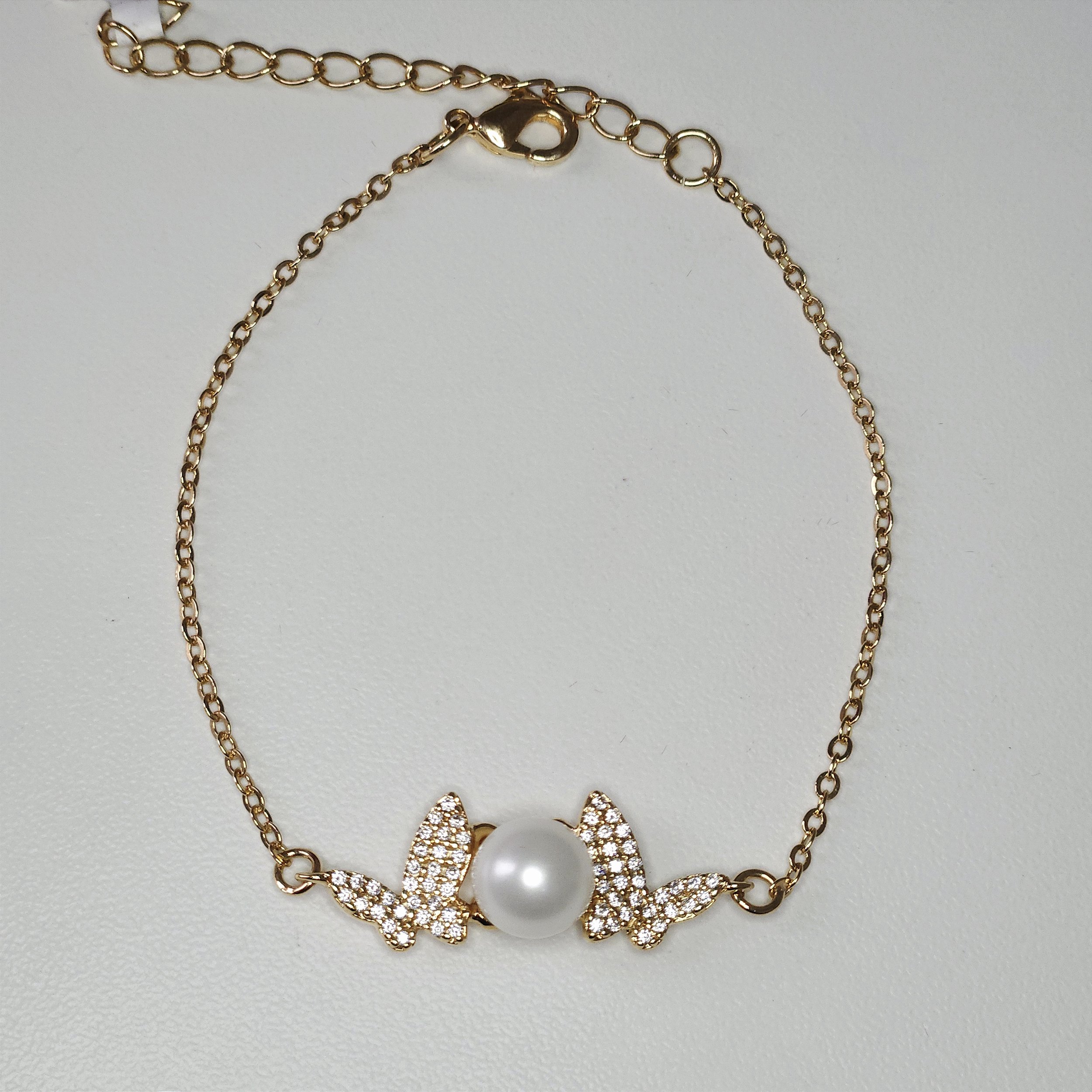 PULSEIRA DOURADA COM 2 BORBOLETAS CRAVEJADAS E UMA PEROLA NO MEIO
