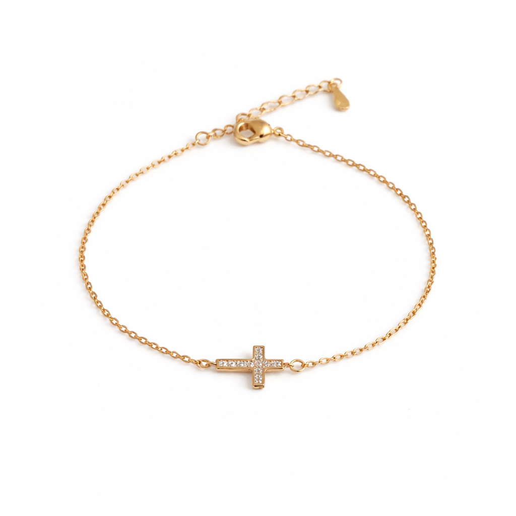 PULSEIRA DOURADA COM CRUZ DE ZIRCÔNIAS BRANCAS DEITADA - 17CM + 3CM EXTENSOR