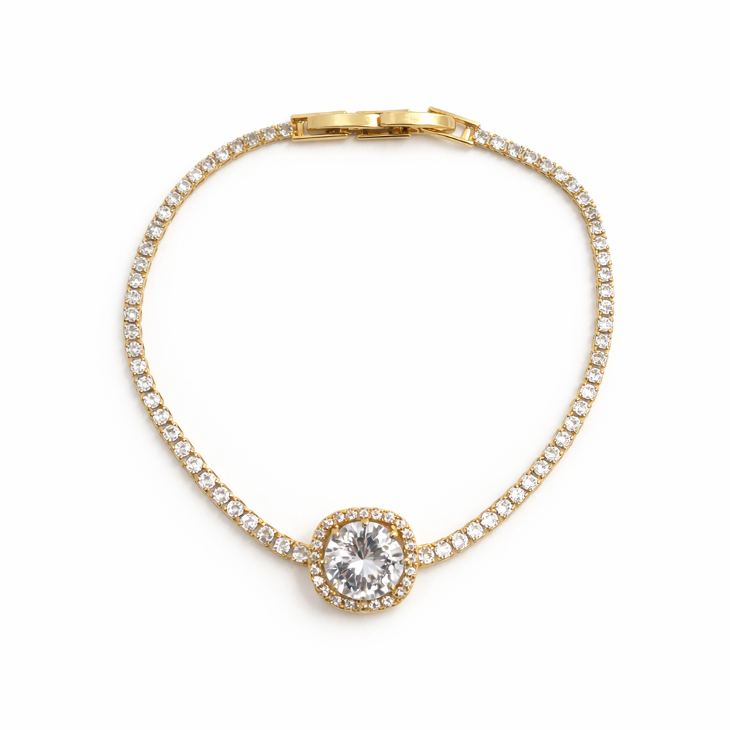 PULSEIRA DOURADA MODELO RIVIERA COM PINGENTE DE ZIRCONIA FORMATO QUADRADO CRAVEJADO AO REDOR