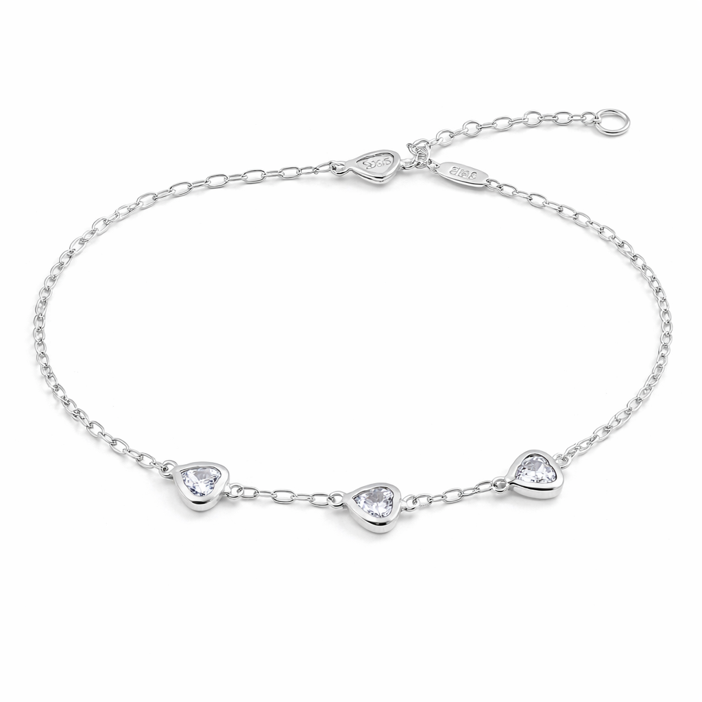 PULSEIRA PRATA ELOS COM 3 CORAÇÕES COM ZIRCÔNIAS BRANCAS NO MEIO - 18CM + 2CM EXTENSOR
