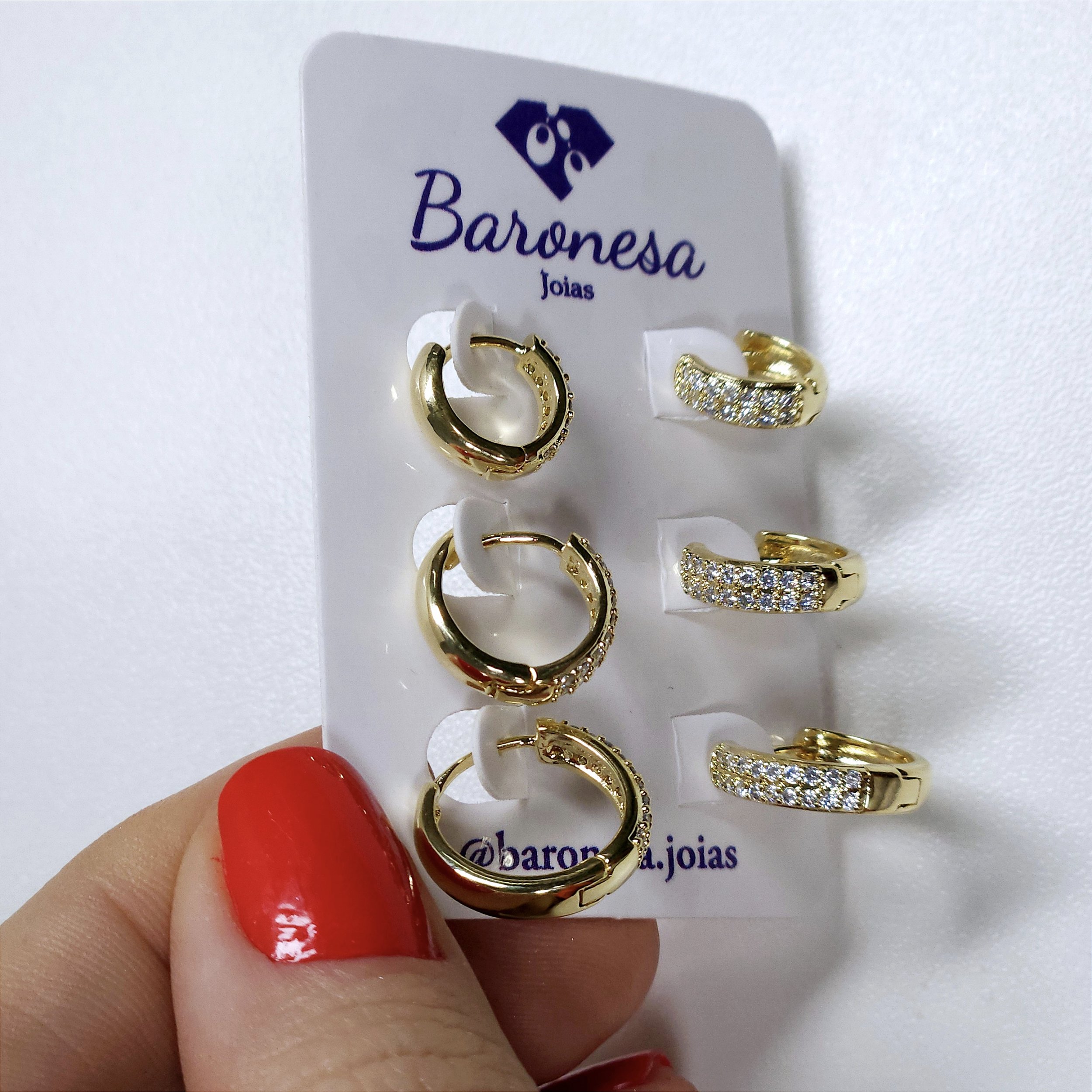 TRIO DE ARGOLAS DOURADAS COM 2 FIOS DE ZIRCÔNIAS CRAVEJADAS NA FRENTE