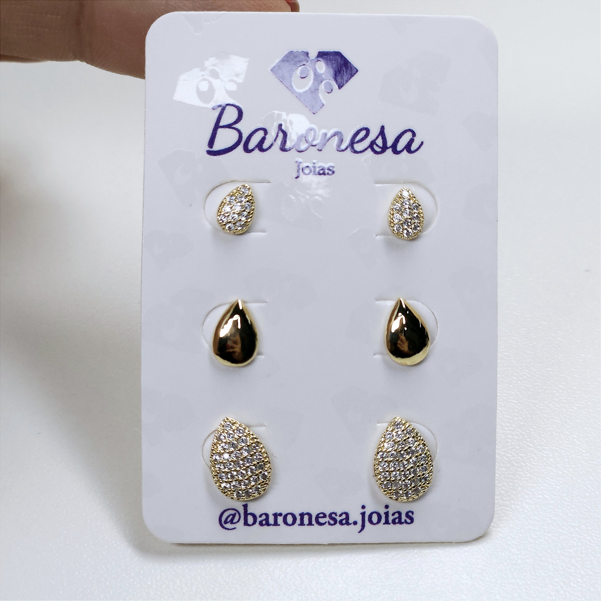 TRIO DE BRINCOS DOURADOS FORMATO GOTA DA MAIOR PARA MENOR TODA CRAVEJADA E UM PAR LISO