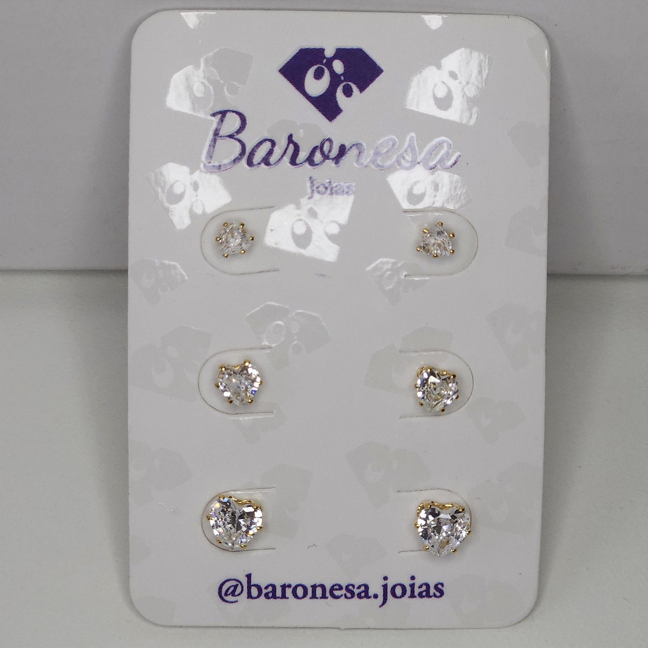 TRIO DOURADOS DE BRINCOS DE CORAÇÃO ZIRCÔNIAS BRANCAS